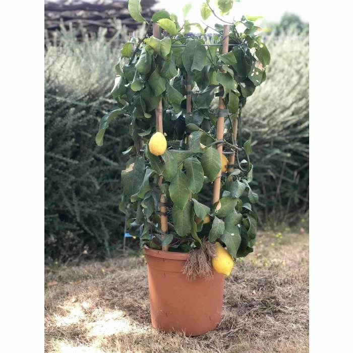 This particular tree would make a fantastic gift with its unique circular form. It has been trained around a bamboo frame to create its interesting shape. Not only does it look good it also provides a bigger surface area so it will produce even more lemons despite it being small in stature.